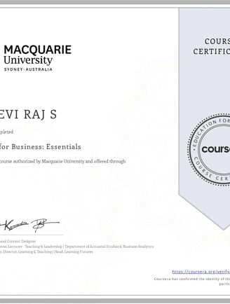 My professional journey began in July 2017 when I joined Potential Solutions Private Limited as a part-time E-Pub Developer. After completing my undergraduate studies, I transitioned into a full-time role with the same organization, where I worked until July 2019. With a keen interest in organizational operations, I shifted my career path toward administration and human resources. In July 2019, I joined the HR Department at SRM Group of Institutions, Tiruchirappalli. Soon after joining, I enrolled in an MBA program in Human Resource Management through Alagappa University (distance education). The practical experience I gained at SRM greatly enriched my academic learning during my postgraduate studies. To further enhance my skills, I also completed an online certification course titled Excel Skills for Business: Essentials from Macquarie University, Australia.